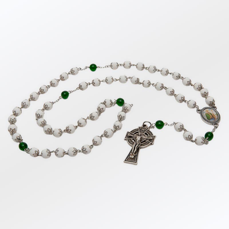 The Irish Rosary features green glass our father beads, a floral center, and a Celtic crucifix.